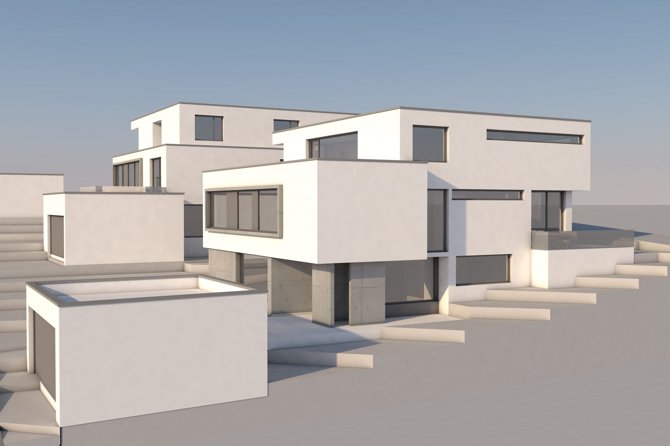 Die Energieeffizienz55-Häuser werden mit Erdenergie in Kombination mit Wärmepumpen beheizt und sind mit kontrollierten Wohnraumlüftungsanlagen mit Wärmerückgewinnung ausgestattet. Photovoltaikanlagen mit Batteriespeichern und eine KNX-Anlage ergänzen die Gebäudetechnik. Sichtbetonwände untermalen sowohl an Innenwänden, als auch an Fassaden und Außenbereichen die Architektur.