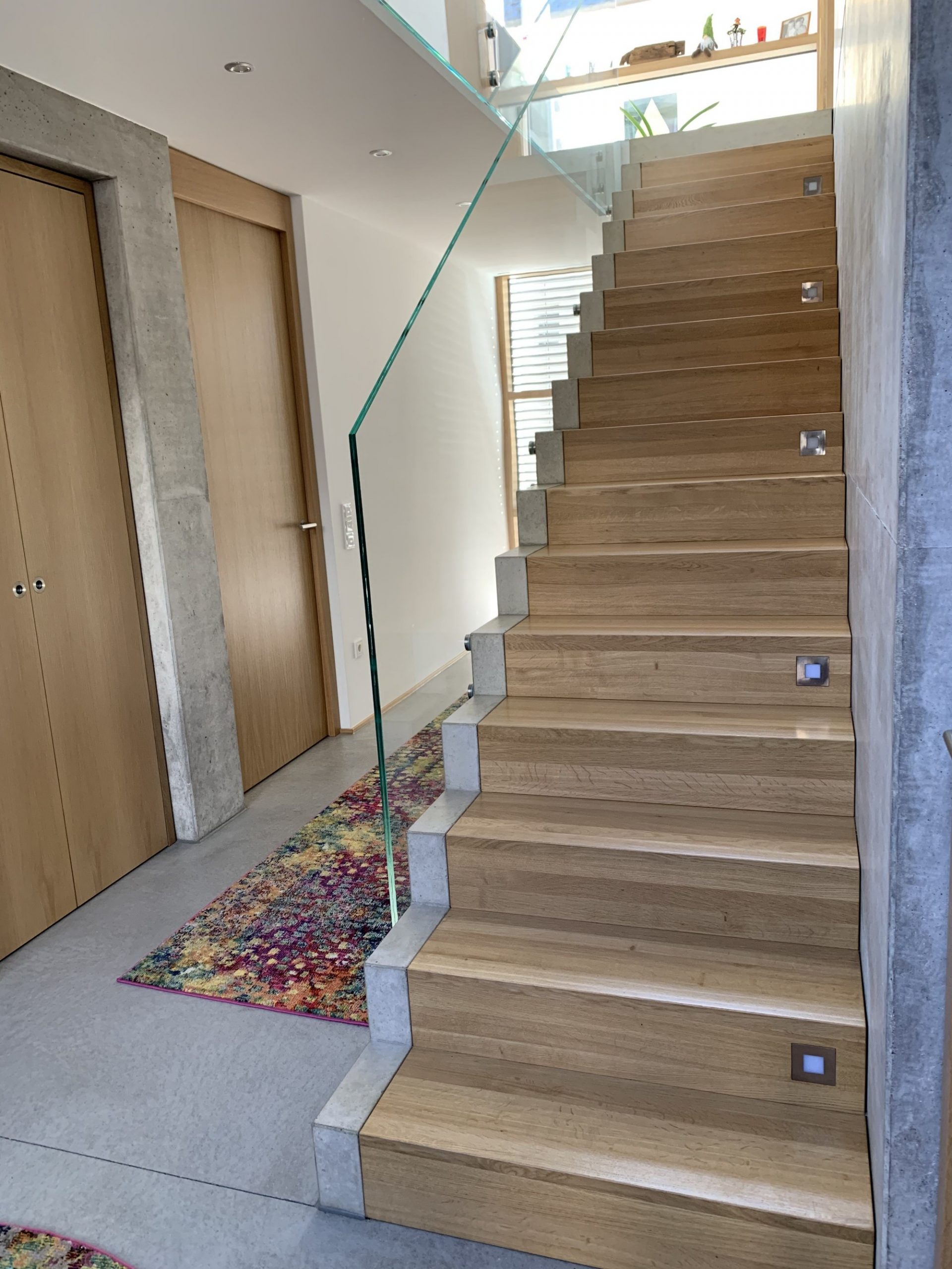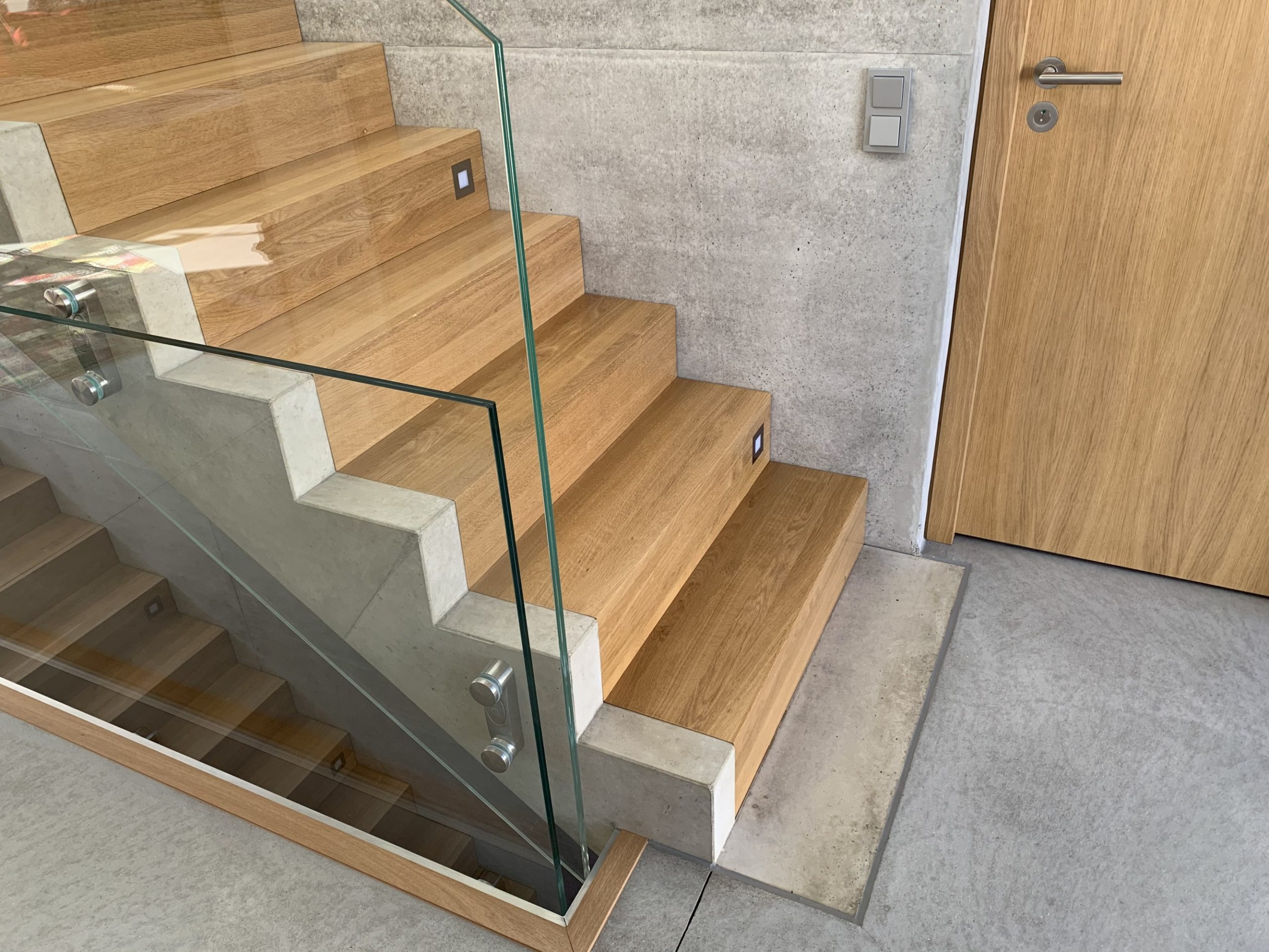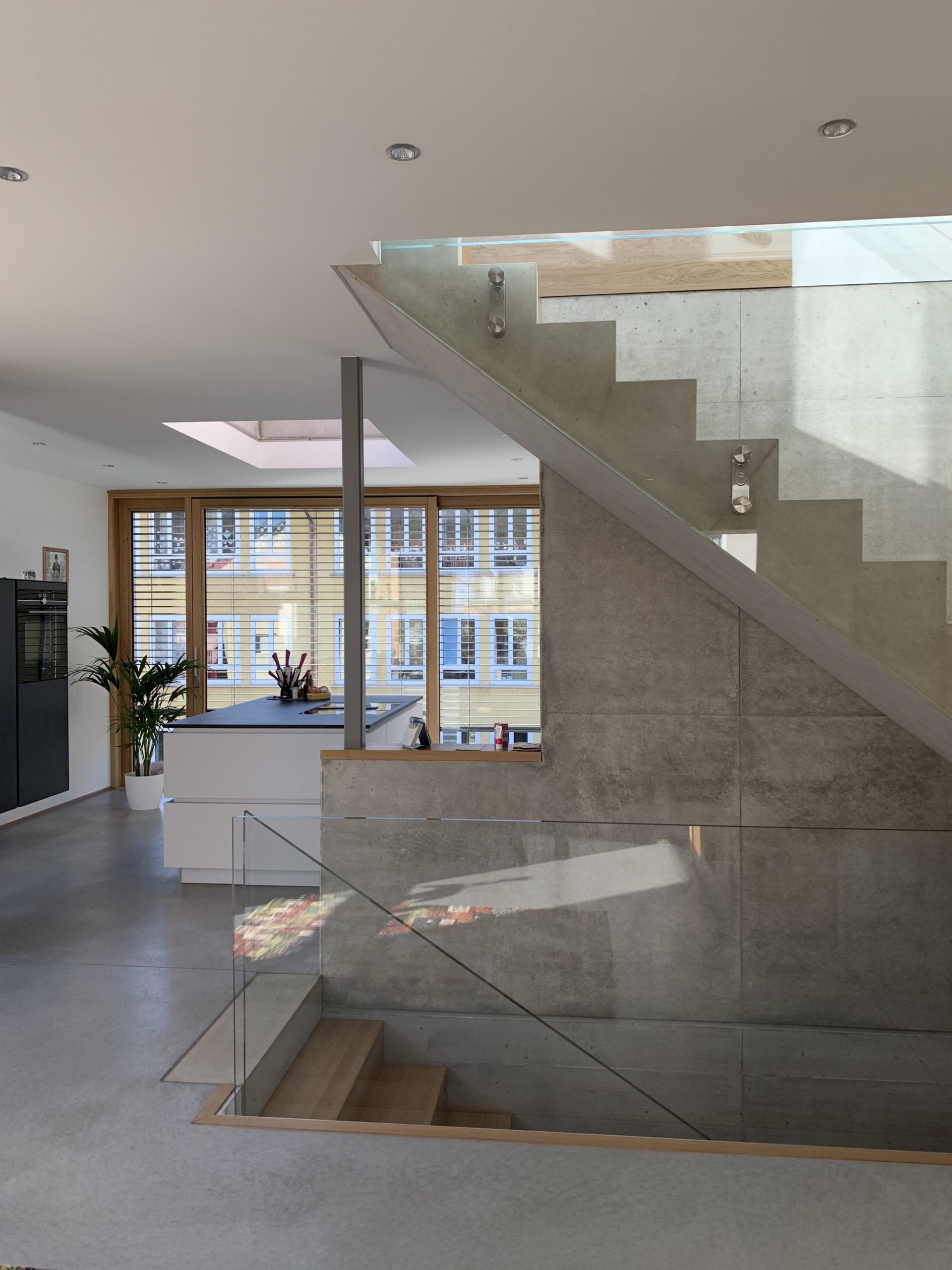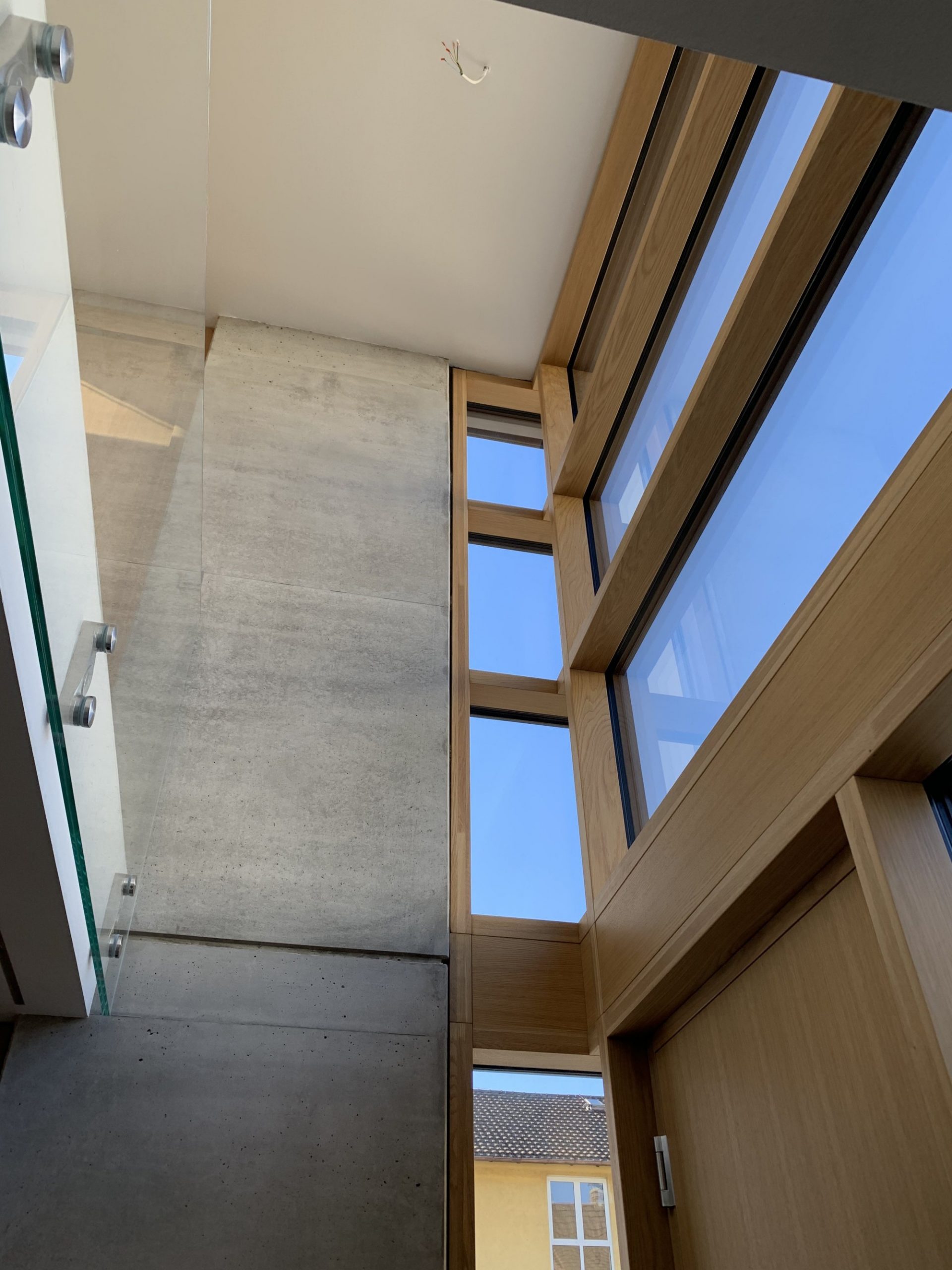 Sichtbeton, Eichenholz, Putz & Sichtestrich setzen sich zu einer schönen gestalterischen Einheit zusammen.