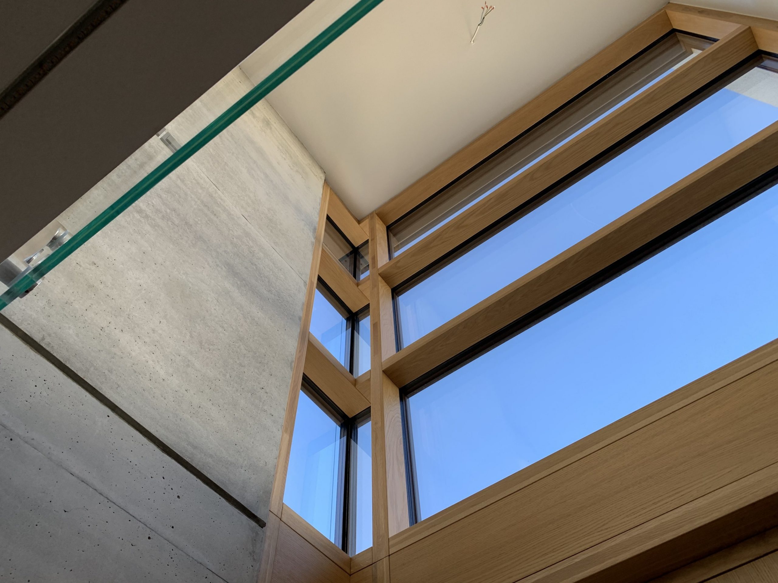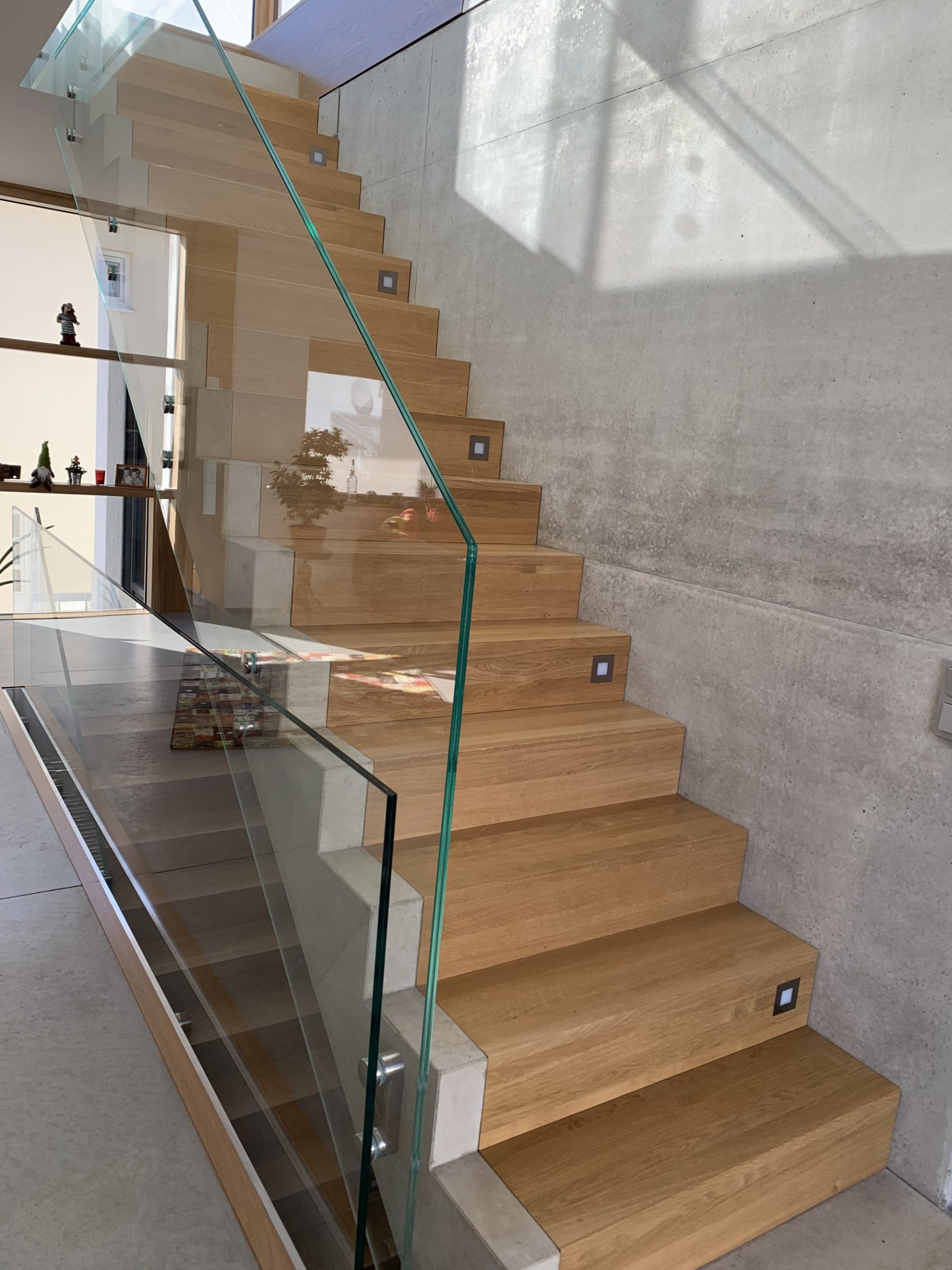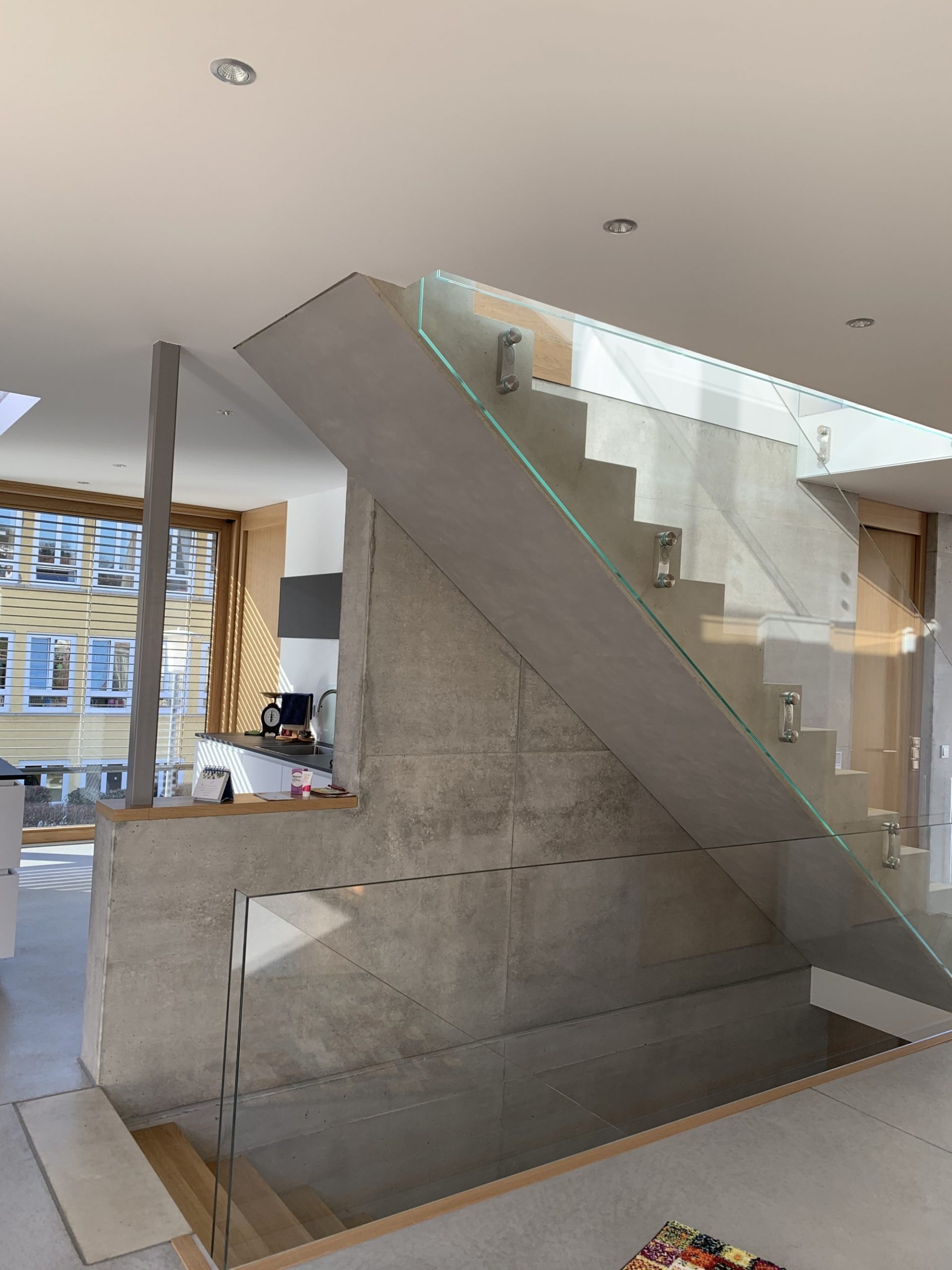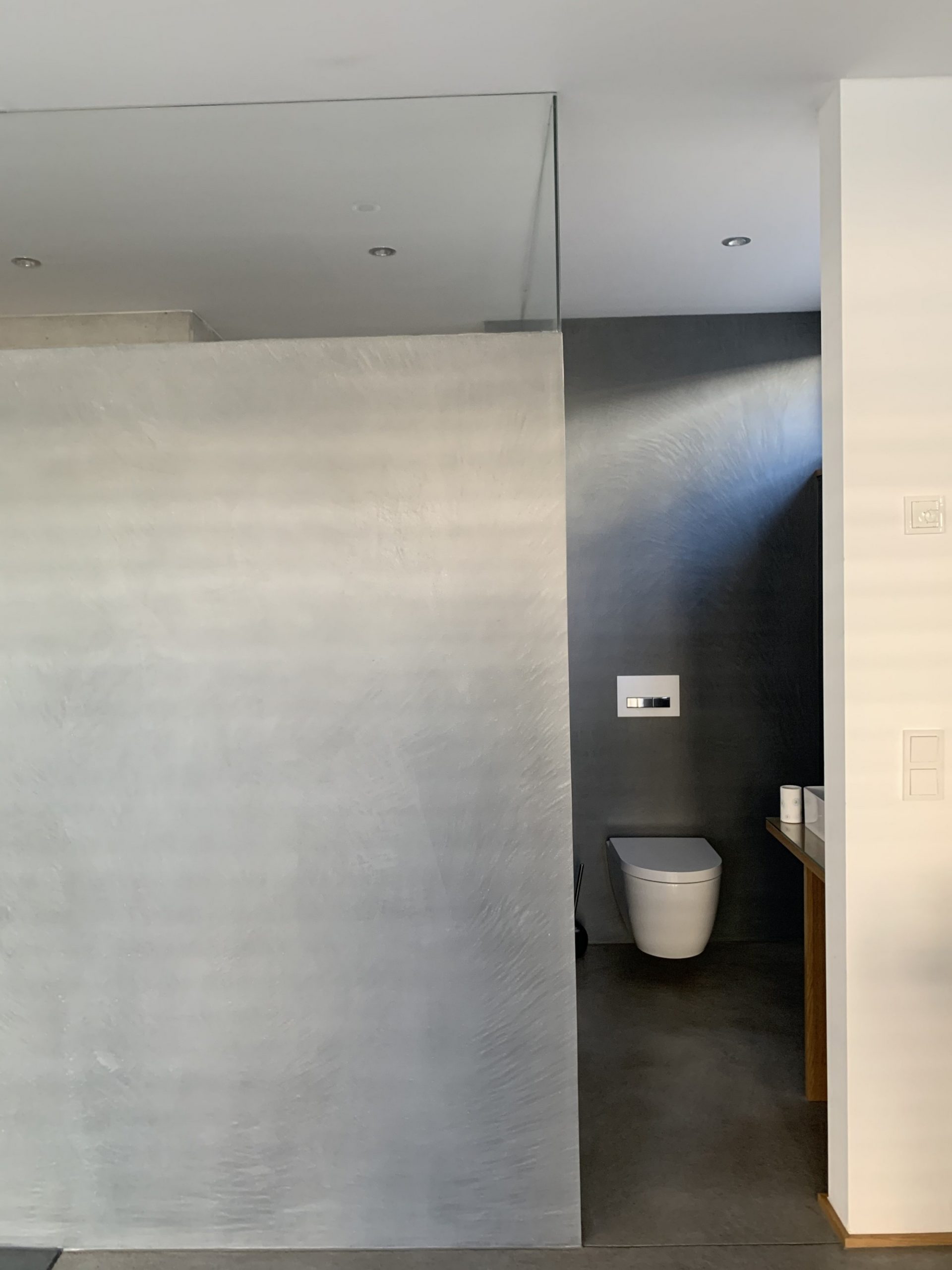 Sichtbeton, Eichenholz, Putz & Sichtestrich setzen sich zu einer schönen gestalterischen Einheit zusammen.
